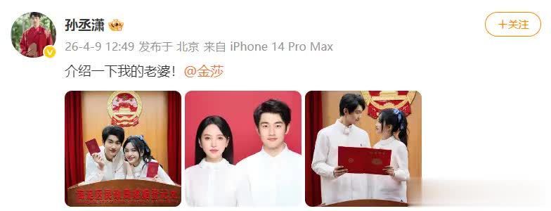 据现代快报消息,4月9日中午,演员、歌手金莎于个人社媒晒出与孙丞潇的合照,并配文“介绍一下我的老公”,官宣已领证结婚。随后,孙丞潇发文回应:“介绍一下我的老婆!”。从孙丞潇发布的照片能够看出,二人领证时间为2026年2月13日。